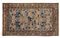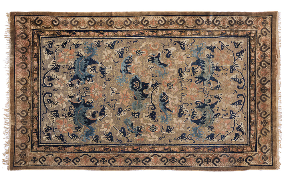 A silk and metal-thread carpet, woven in blue and biege tones, depicting Buddhist lions and flowers