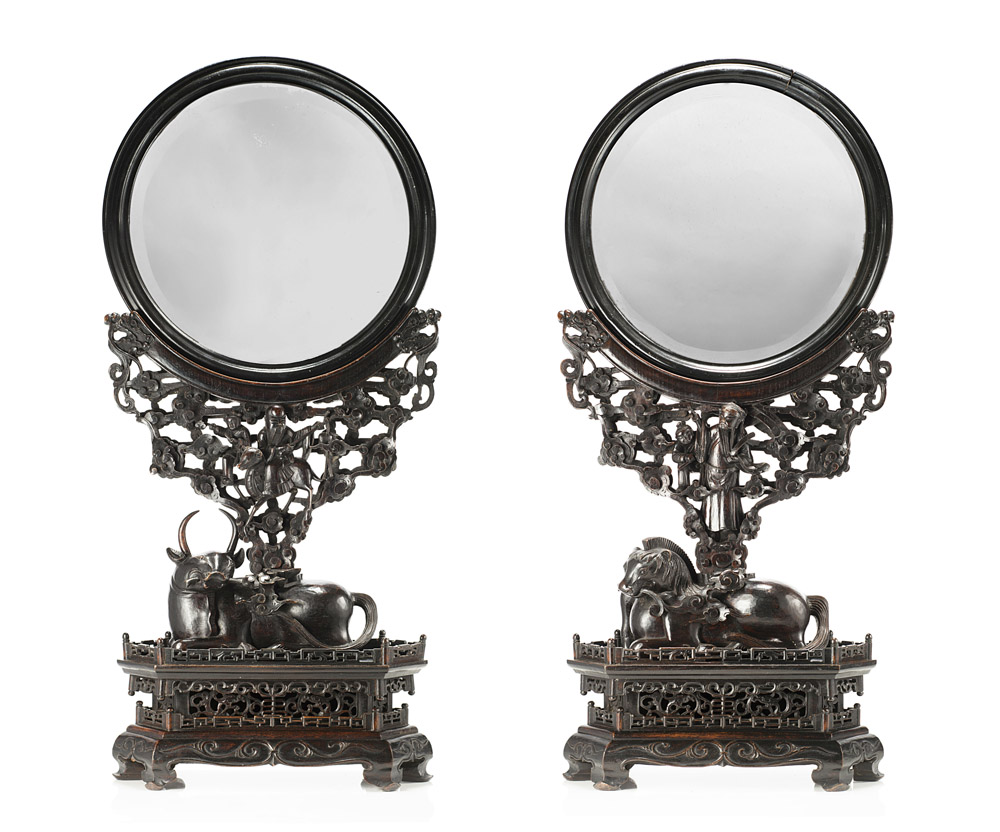 A pair of large circular mirrors with carved and pierced hongmu supports, one modelled as a recumbent buffalo, the other as a recumbent horse surrounded by flowering branches and plants.