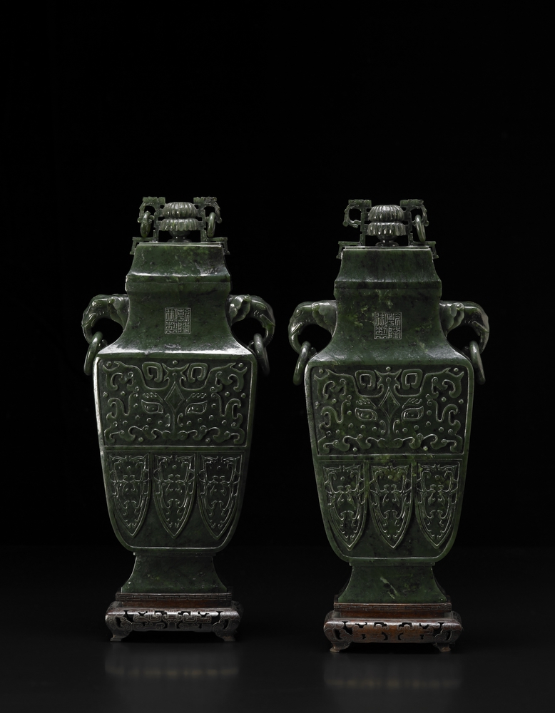 Coppia di raffinati vasi con coperchio in giada color verde spinacio, la caratteristica forma rettangolare hu di ispirazione arcaica, con piede leggermente inarcato, con coppia di teste elefantine sui lati a sospendere anelli decorativi, ciascun vaso finemente intagliato con dettagliatissimo decoro arcaico di maschere taotie e motivi geometrici stilizzati, i coperchi sormontati da doppi fiori fiancheggiati da elaborati draghi stilizzati impreziositi da ulteriori piccoli anelli, la pietra di un vibrante color spinacio con tipiche inclusioni e venature naturali di varie tonalità più scure e più chiare, ciascuno reca marchio apocrifo quadrato a sei caratteri arcaici dell'imperatore Qianlong, con basi in legno intagliate con decorazione argentata. A pair of fine spinach-green jade hu vases and covers, each with twin elephant head handles suspending loose rings, the body finely carved with detailed taotie masks above stylised geometric motifs, the foot slightly splayed, each cover surmounted by a double flowers finial flanked by elaborate stylised archaistic dragons embellished with further small loose rings, the stone of a vibrant spinach green tone with natural lighter and darker inclusions, each with incised apocryphal Qianlong six-character seal mark in a square, with carved wood stands with silver decoration (h. 33 cm.)