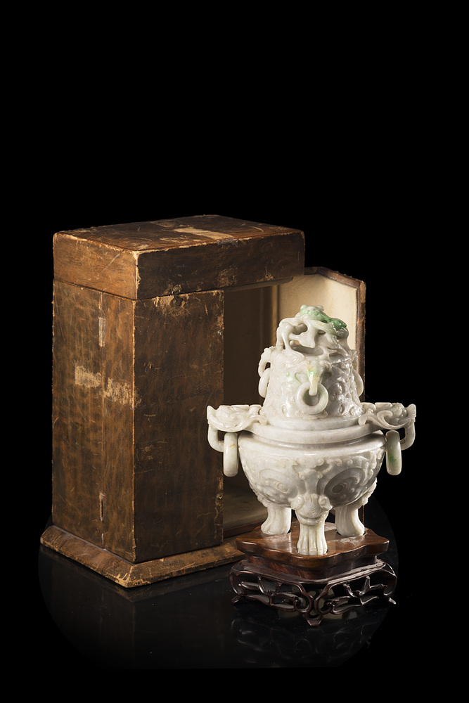 Incensiere tripode in giadeite color celadon con screziature verde mela, il corpo decorato a rilievo con maschere taotie supportato da gambe leonine, il coperchio con intaglio simile, sormontato da un drago, con tre anse elefantine e anelli (alcune piccole mancanze), con base in