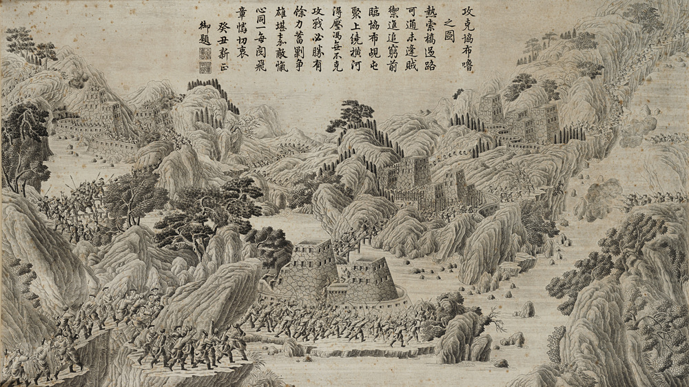 Stampa raffigurante le conquiste militari dell'imperatore Qianlong, parte di una serie. "Attacco a Xiebulu", quinto foglio di una serie di otto stampe illustranti la spedizione punitiva dell'esercito dell'imperatore Qianlong contro l'esercito dei Gurkha durante l'invasione del Tibet tra il 1790 e il 1792 Cina, epoca Qianlong (1735-1796) "Attack on Xiebulu", fifth leaf of a series of eight engravings illustrating a punitive expedition of the troops of Emperor Qianlong against Gurkha's army, during the Tibetan invasion between 1790 and 1792 China, Qianlong period (1735-1796) La battaglia di Xiebulu si colloca all'interno della guerra cino-nepalese, durata dal 1788 al 1792. L'invasione nepalese del Tibet, amministrato dalla corte Qing, si tramutò da una semplice guerra locale ad una campagna militare a tutti gli effetti coordinata dall'imperatore Qianlong e dai suoi strateghi. The battle of Xiebulu is part of the Sino-Nepalese war (1788-1792). When Nepal invaded Tibet, which was under the administrative rule of the Qing dynasty, it looked like a local conflict due to be solved easily. Hower, it eventually turned in a proper military action, coordinated by the Qianlong Emperor and his military officers.