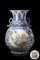 Vaso biansato con decorazione blu su fondo bianco a motivi di foglie e fiori di loto, con pannelli circolari in policromia raffiguranti Immortali in viaggio o sulle sponde di un fiume, marchio apocrifo Qianlong sul fondo. Le anse del vaso con difetti di manifattura