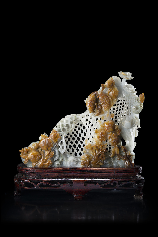 Gruppo in giada celadon e ruggine raffigurante una rete con pesci, con base in legno Cina, sec. XX A celadon and russet jade group depicting a fishnet with carps China, 20th century (h. 15 cm.)