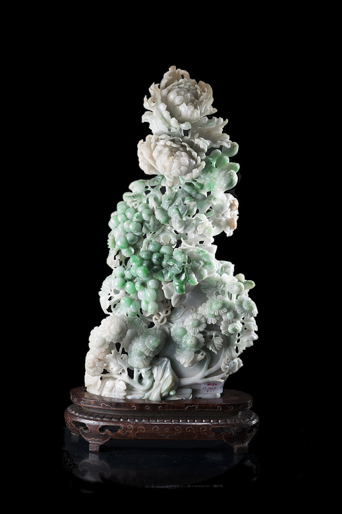 Gruppo in giadeite verde mela raffigurante un vaso contornato da fiori e grappoli d'uva, con base in legno Cina, sec. XX An apple green jadeite group depicting a vase surrounded by flowers and grapes China, 20th century (h. 35 cm.)
