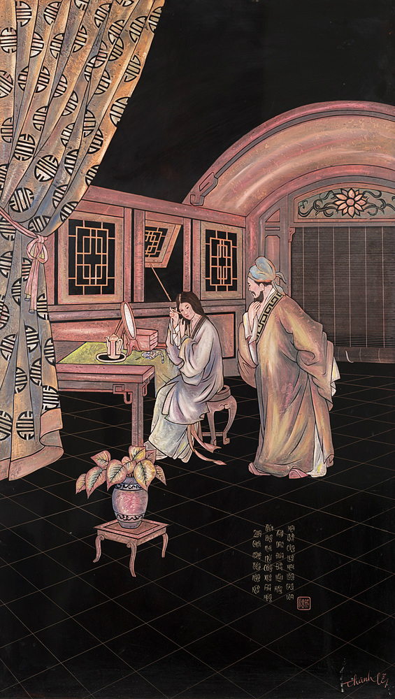 Grande pannello laccato e inciso, con decorazione in policromia raffigurante un interno con dama seduta allo specchio e figura maschile, con iscrizione, firmato Thành Le Vietnam, sec. XX A large black-lacquered panel with incised decoration of an interior scene featuring a lady seated by a mirror and a standing gentlemen, with inscription and signed Thành Le Vietnam, 20th century (122x70 cm.)