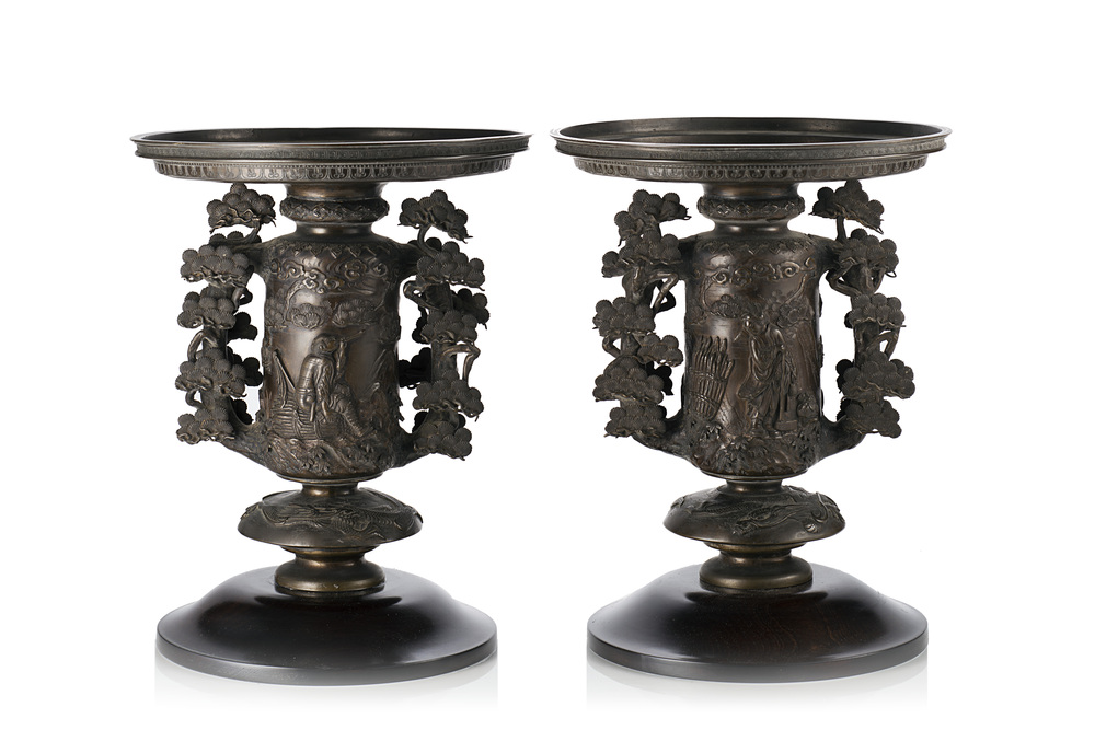 Coppia di bruciancensi in bronzo decorati in rilievo con rami fiori e dragoni incisi, con base in legno Giappone, tardo periodo Meiji, sec. XX A pair of bronze incense holders, decorated in high relief with flowering branches and incised dragons, with wood bases Japan, late Meiji period, 20th century (h. 33 cm.)