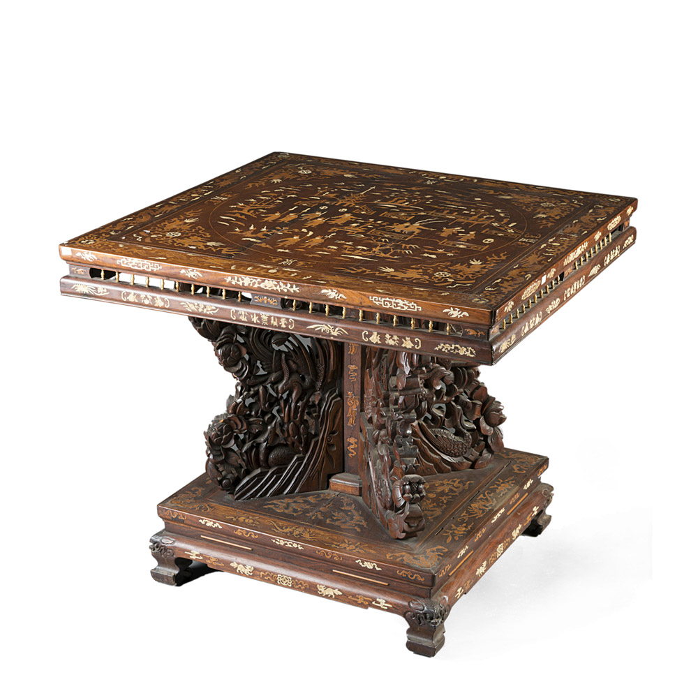 Tavolo quadrato riccamente intarsiato in osso con piano decorato al centro con soldati in un giardino popolato di creature mitologiche e draghi sul bordo. Poggiante su base squadrata con dragoni e leoni buddhisti, piedi intagliati all'attacco. (difetti e mancanze) Cina, fine sec. XIX - inizio sec. XX A richly decorated table inlaid with bone. (defects and losses) China, late 19th - early 20th century (h. 79 cm.; l. 92 cm.)