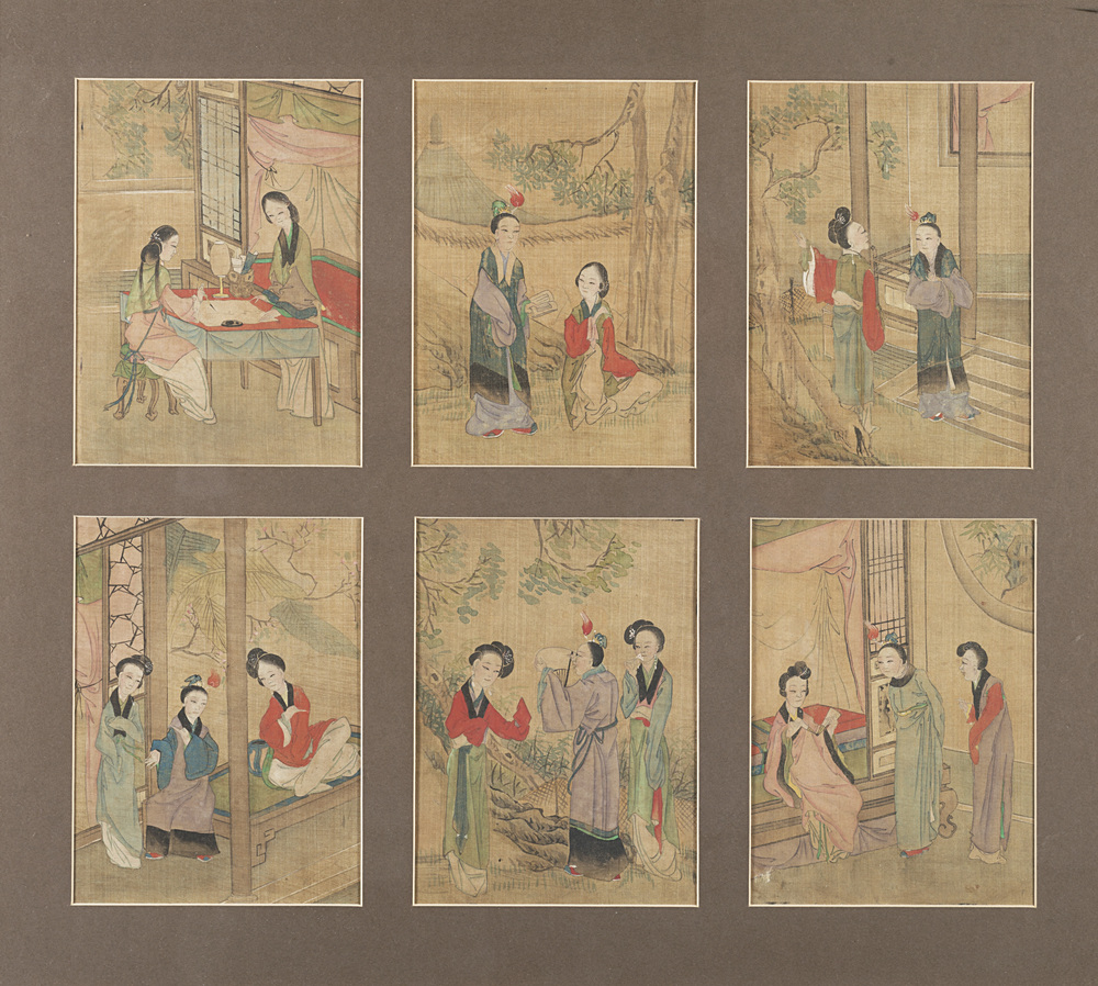 Sei dipinti raffiguranti eleganti dame in interni e giardini, con iscrizioni e sigilli. Inchiostro e colore su seta, montati e incorniciati. Cina, sec. XX Six paintings depicting elegant ladies in interiors and garden scenes, with inscriptions and seals. Ink and colours on silk, mounted and framed. China, 20th century (22x17 cm.)