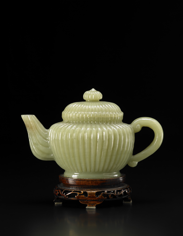 Piccola teiera con coperchio in giada color celadon scuro, il corpo lobato dalla forma tondeggiante, il manico liscio, la pietra con naturali inclusioni e venature, con base in legno Cina, sec. XX A dark celadon jade teapot and cover, the lobed body of globular form, the handle plain, the stone with natural inclusions and flaw lines China, 20th century (l. max.18,5 cm.)