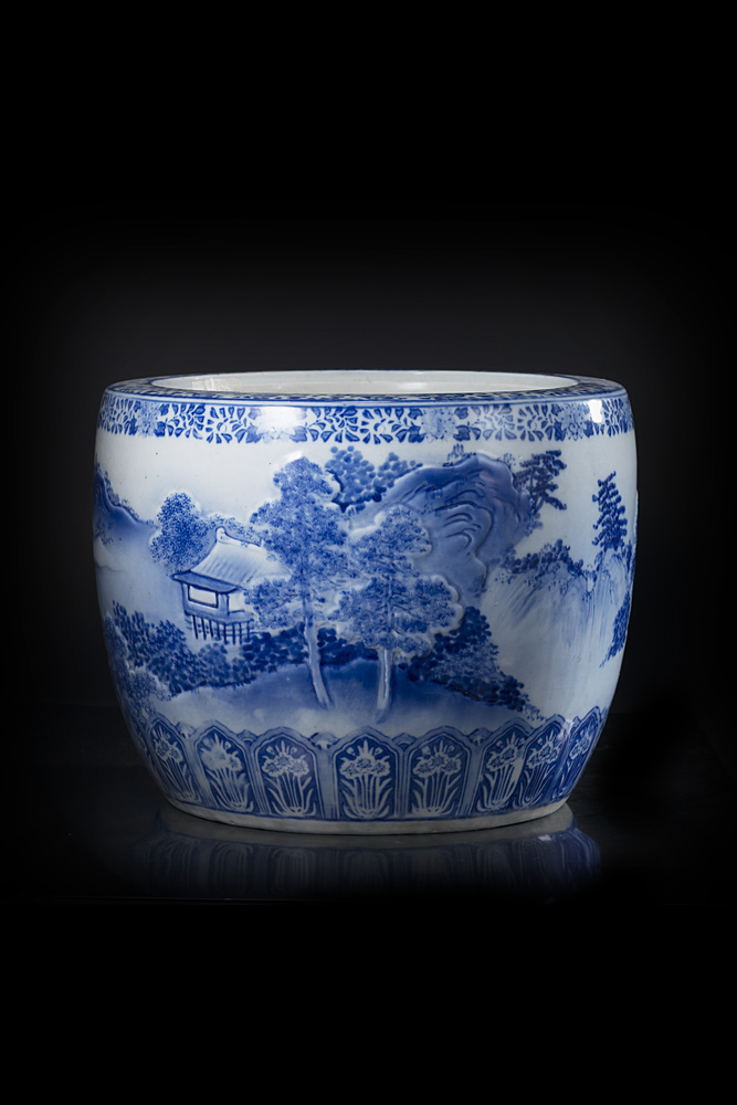 Braciere in porcellana bianca e blu decorato con paesaggio tra due bande decorate con motivi geometrici Giappone, periodo Meiji (1868-1912) A blue and white porcelain jardiniere, painted with a continuous landscape scene within two bands with geometric decoration Japan, Meiji period (1868-1912) (diam. 34,5 cm.)