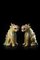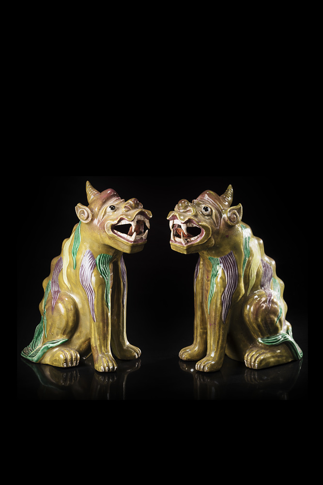 Due piccole Qilin in porcellana smaltata in verde, turchese e violetto, raffigurate sedute, l'espressione feroce che rivela le zanne Cina, dinastia Qing (1644-1911) Two porcelain models of Qilin, enamelled in green, turquoise and aubergine, the beasts seated, with ferocious expression revealing the fangs China, Qing dynasty (1644-1911) (h. 17 cm.)