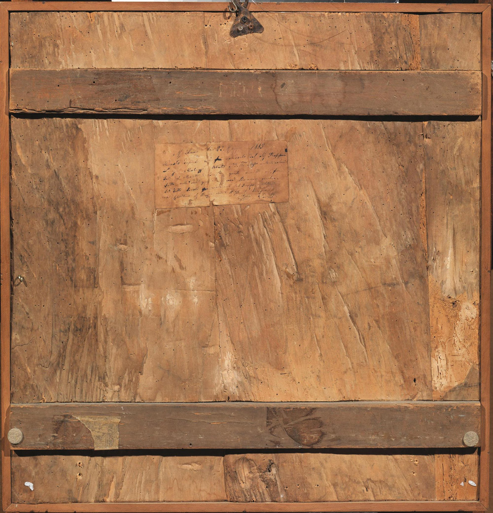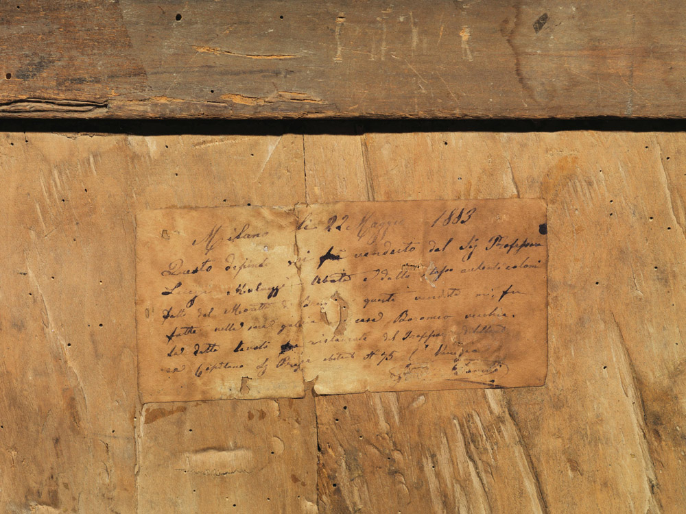 sul retro etichetta ad inchiostro : "Milano lì 22 Maggio 1883/ Questo dipinto mi fu venduto dal Sig Professore Luigi Malvezzi (.....) e dallo stesso autotenticatomi fatto dal Moretto di Brescia (.....) questa vendita mi fu fatta nella sua galleria in casa Boromeo vecchia. / La detta tavola fu ristaurata dal professor (.....) Capitano di Piazza abitante al 75 Venezia. Luigi Bianconi (?);