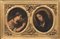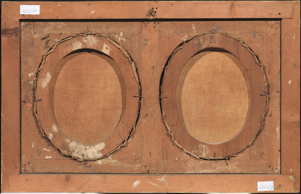 coppia di dipinti ad olio su tela ovali, cm 32x26,5 ciascuno, in un'unica cornice intagliata e dorata cm 39,5x65
