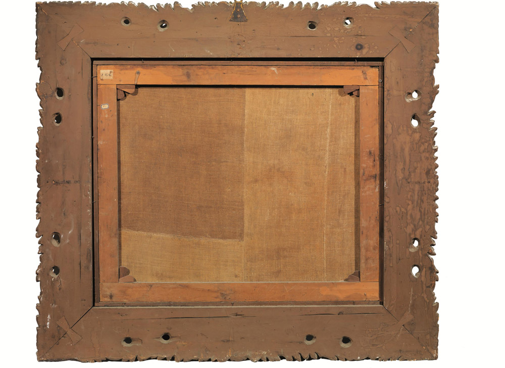 olio su tela, cm 95X113 entro cornice antica dorata, riccamente intagliata a volute, foglie e mascheroni