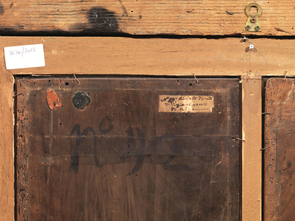 al verso timbri a ceralacca, numeri d'inventario a bistro e etichetta con riferimenti a Tiziano Vecellio