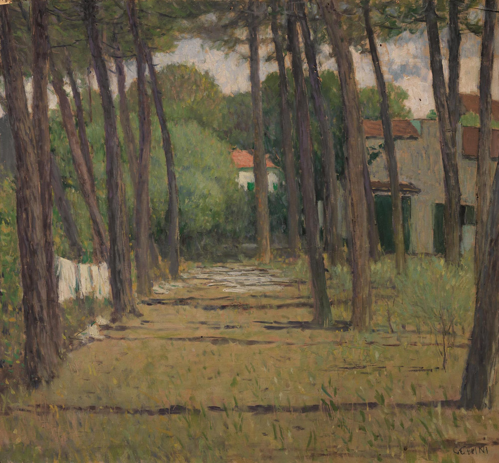 Galileo Chini (Firenze 1873 - 1956) CASA IN PINETA olio su compensato , cm...