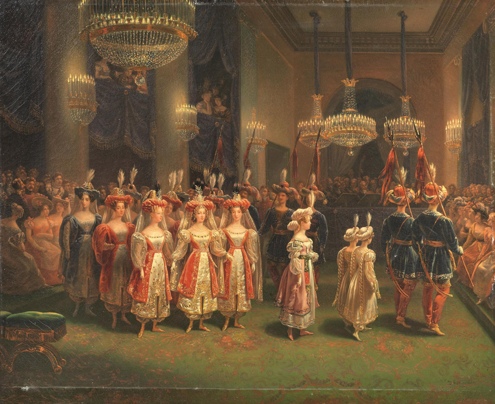 Il sontuoso ballo in costumi orientali è ambientato all'interno dello storico Palazzo delle Tuileries, già posto sulla riva destra della Senna, di fronte al Palazzo del Louvre e all'interno degli omonimi giardini. La costruzione dell'edificio, partita nel 1564, era stata commissionata da Caterina de' Medici, vedova di Enrico II di Francia, all'architetto Philibert de l'Orme; durante il regno di Enrico IV (1589-1610), l'edificio fu ampliato verso sud, a congiungersi con la Grande Galerie che correva lungo il fiume, e poi ancora verso nord alla metà del XVII secolo. Una nuova ala fu poi costruita nel 1808, sotto Napoleone: con la trasformazione in residenza imperiale, gli interni del palazzo vennero ridecorati in stile impero. L'edificio andò distrutto il 23 maggio 1871, in seguito all'incendio appiccato da uomini agli ordini dell'estremista Dardelle, durante la repressione della Comune; nel 1882 l'Assemblea Nazionale Francese decretò la demolizione delle rovine del palazzo, che ebbe luogo nel 1883.