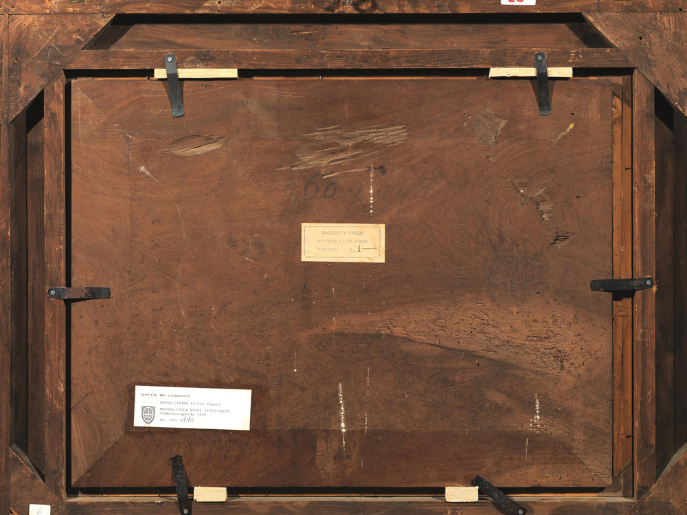 sul retro: etichetta "Raccolta Eredi / Pittore Luigi Rossi / Dipinto n. 1", etichetta "Città di Lugano / Museo Civico (Villa Ciani) / Mostra Luigi Rossi (1853-1923) / febbraio-aprile 1980 / no. cat. 142"