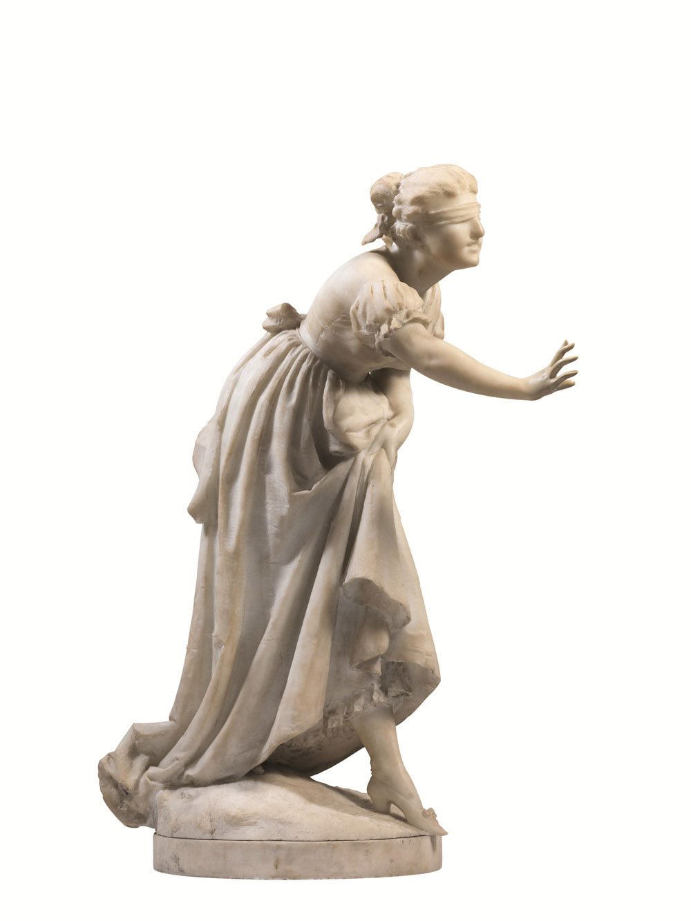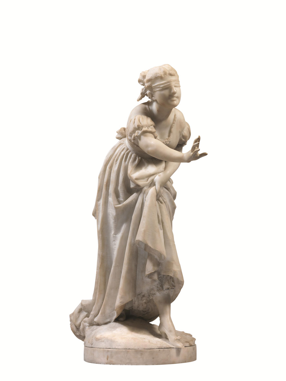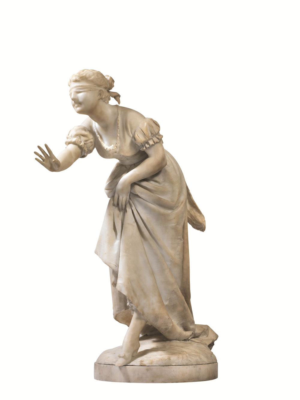 "Verosimilmente identificabile con l’opera ricordata da Stella e Corradino, la leggiadra figurina femminile che, bendata, tende il braccio destro in avanti nel gioco della mosca cieca, è parte di quella produzione di Tabacchi meno impegnata, ma di elevatissima qualità, destinata ad un pubblico borghese tendenzialmente antibigotto. Sono figure di giovani donne che, seducenti, con finto candore si offrono agli sguardi esprimendo una gioia di vivere essenzialmente fisica.