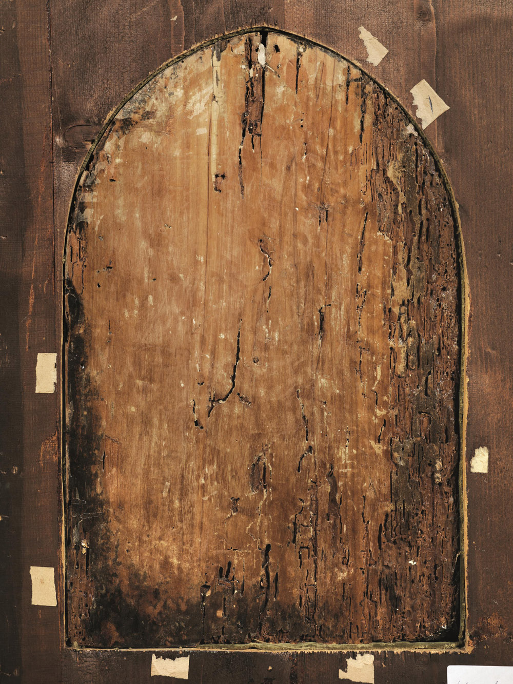 Già riferita nella collezione di provenienza, per tradizione orale, al pittore senese Sano di Pietro, la pregevole tavola fondo oro cuspidata, raffigurante San Francesco d’Assisi, un Santo Vescovo, probabilmente S. Nicola di Bari, e Santa Lucia, impreziosita da una fine punzonatura, è per ragioni stilistiche piuttosto riconducibile all’ambiente artistico fiorentino intorno alla metà del Quattrocento. L’opera è avvicinabile a personalità artistiche come Domenico di Michelino (Firenze 1417/18-1491), pittore e miniaturista formatosi nella cerchia dell’Angelico e di Zanobi Strozzi, poi influenzato anche da Filippo Lippi. Nell’opera si riscontrano talune affinità con questo artista, come nella costruzione dei panneggi, risolti con un tenero cromatismo arricchito di cangiantismi di derivazione angelichiana, nelle peculiari fisionomie dei santi, come nel volto di Santa Lucia e in generale nell’espressione un po’ attonita delle figure, sebbene declinate con cadenze maggiormente goticheggianti.