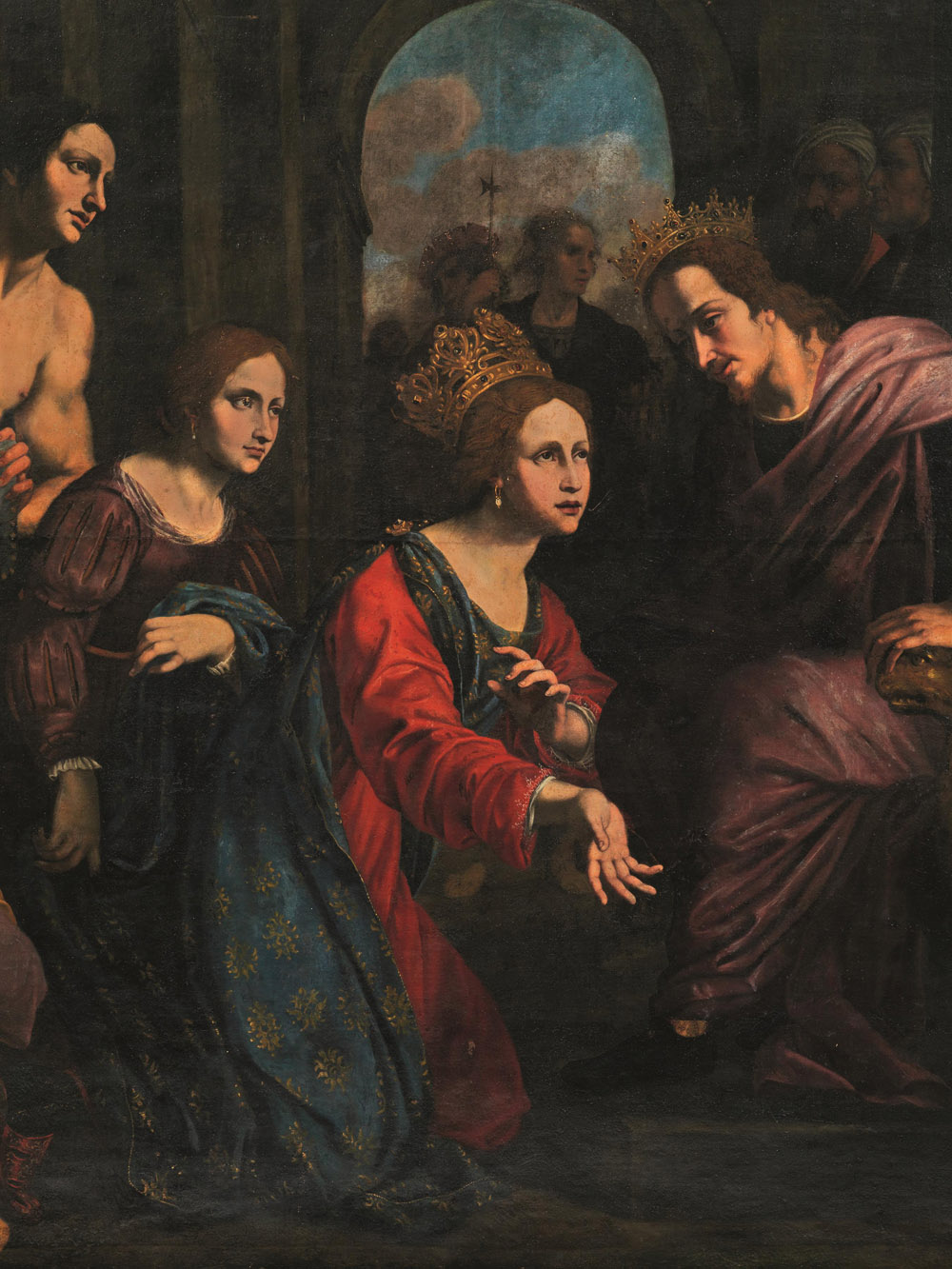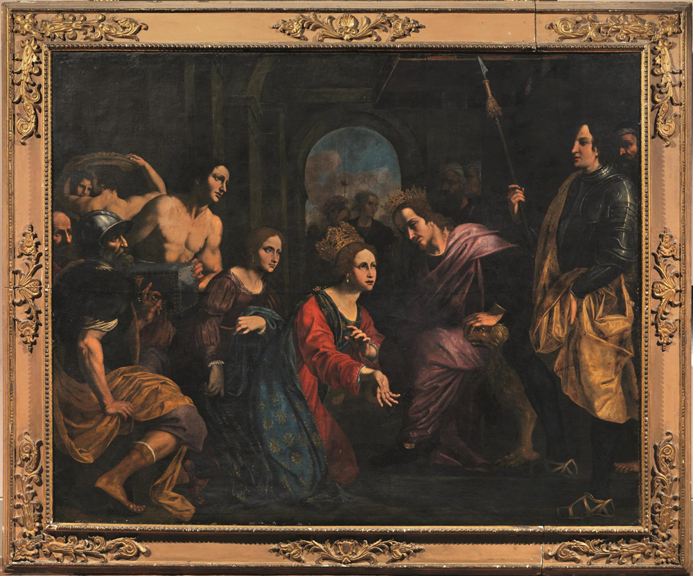 L’opera, di provenienza ab antiquo oggi sconosciuta, raffigura una scena ricca di personaggi, tra i quali un re e una regina, ambientata all’interno di una costruzione in pietra in stile classico. Grazie alla lettura dei personaggi e delle loro pose è possibile riconoscere nell’episodio illustrato l’incontro di Salomone con la regina di Saba. La storia, narrata con dovizia di dettagli nel libro biblico de I Re (10, 1-13), ricorda che la regina dei sabei, il cui nome secondo antiche tradizioni era Machedà o Bilqis, dopo aver appreso della grande saggezza di Salomone decise di recarsi con il suo seguito alla corte del re di Israele. L’incontro tra i due sovrani avvenne nella reggia di Gerusalemme e fu accompagnato da doni provenienti dall’Africa, portati appositamente dalla regina. In cambio dei doni, Salomone dette alla sovrana “quanto ella desiderava e aveva domandato, oltre a quanto le aveva dato con mano regale”. Secondo il Kebra Nagast , antico testo etiope la cui traduzione letterale significa Gloria dei Re, tra Salomone e la regina nacque una breve ma intensa storia d’amore che portò alla nascita di un figlio, Menelich I, futuro sovrano d’Etiopia.