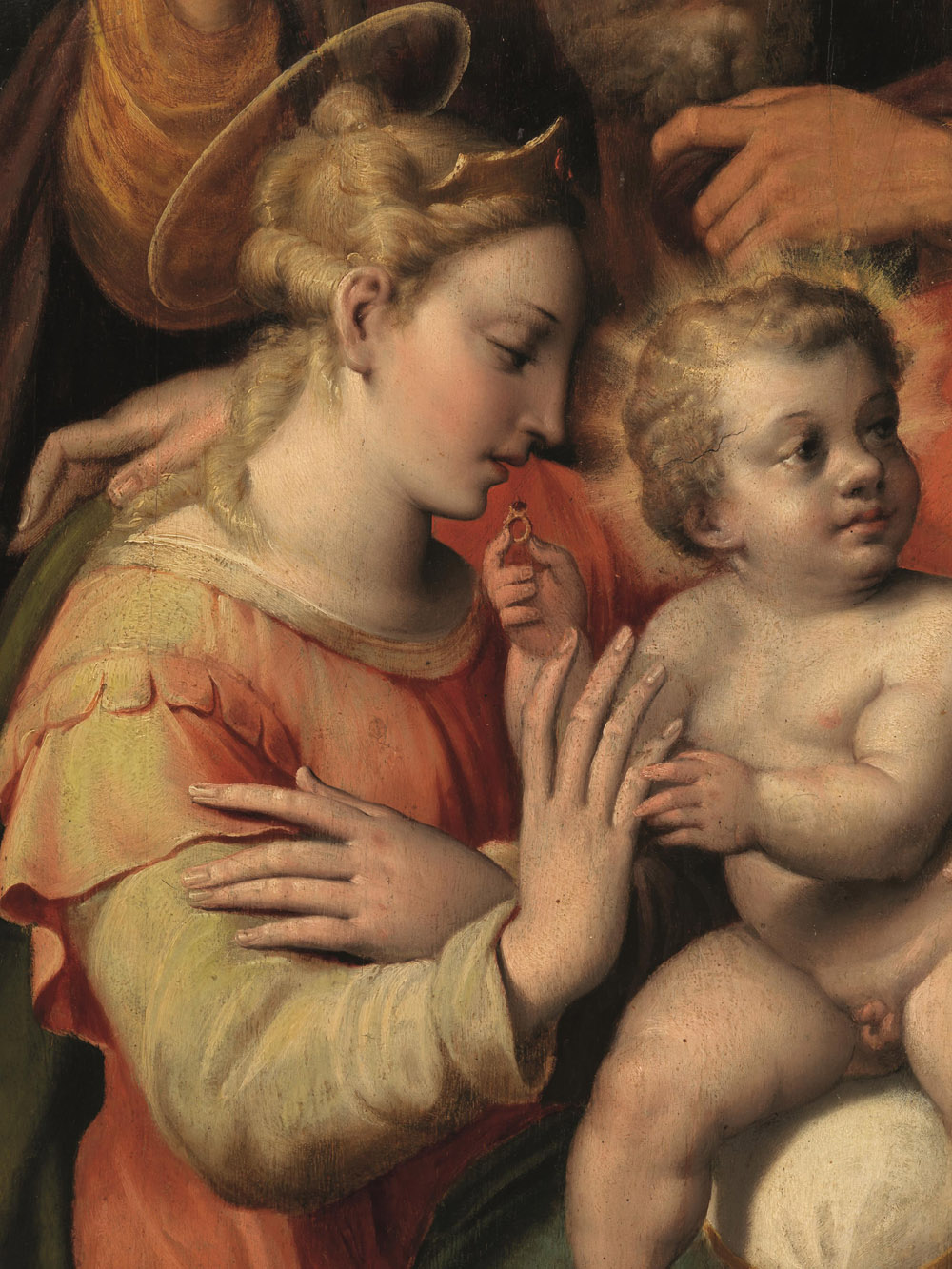 In asta a Londra con il corretto riferimento al Bagnacavallo junior, la tavola qui offerta presenta il tema preferito dal pittore bolognese, o più verosimilmente dai suoi committenti, e da lui più frequentemente proposto sebbene con invenzioni compositive sempre diverse. Tra le diverse versioni, di cui alcune commentate da Elisabetta Sambo ( In margine al Bagnacavallo junior , in “Paragone” 37, 1986, 431-33, pp. 59-65) è quella nella Gemäeldegalerie di Dresda, accompagnata da un disegno all’Albertina di Vienna, a offrire i più stretti confronti con la nostra.