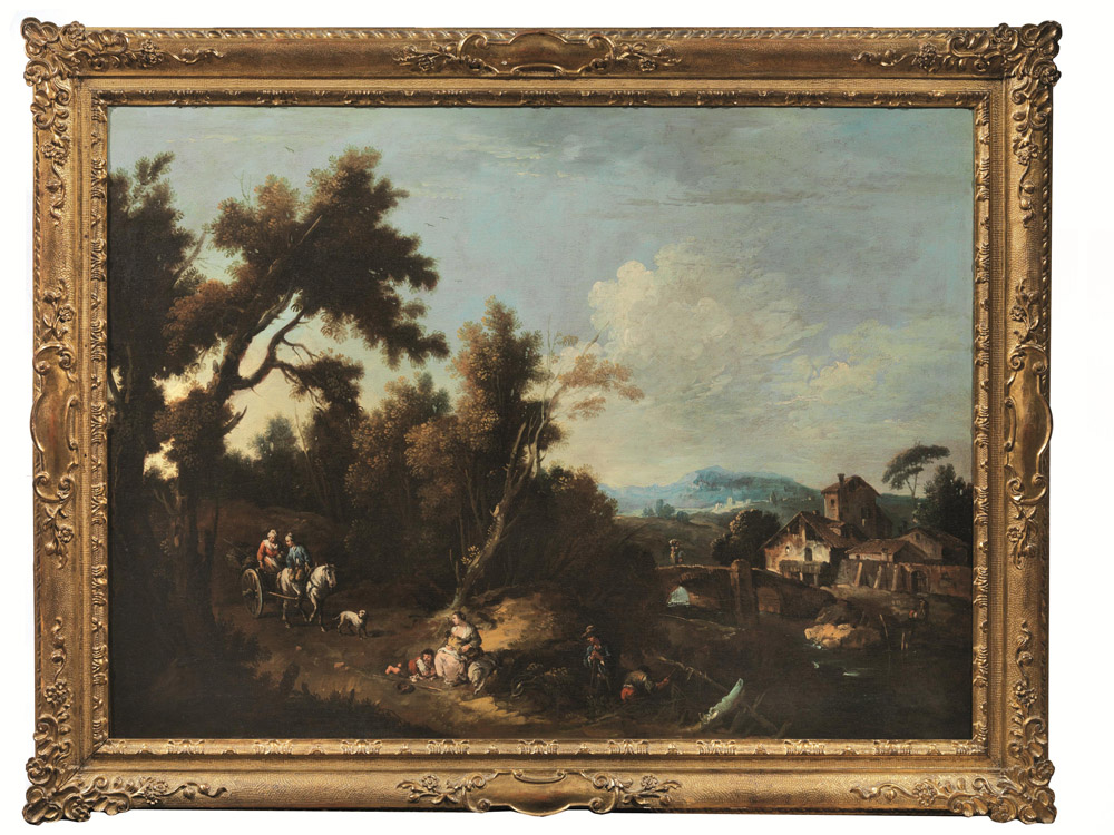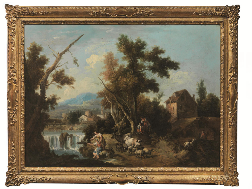 Splendidi esempi della produzione di Giuseppe Zais, le tele qui presentate devono probabilmente situarsi negli anni della maturità del pittore agordino, intorno al settimo decennio del secolo. Ancora sensibile, nel primo dipinto, il richiamo ai modelli paesistici di Marco Ricci, in particolare nelle scelte cromatiche e nell’ambientazione agreste, mentre la tela compagna mostra la piena adesione ai motivi decisamente arcadici proposti da Francesco Zuccarelli, presente a Venezia fin dalla metà degli anni Trenta. E’ appunto sul suo esempio che Giuseppe Zais, iscritto alla Fraglia dei pittori veneziani dal 1748, si allontana progressivamente dal relativo naturalismo dei giovanili paesaggi agresti per aderire alla formula decorativa e alla tavolozza chiara e luminosa con cui il maestro di Pitigliano aveva incontrato il favore dei collezionisti veneziani e di terraferma. Ai suoi modelli si deve appunto il motivo delle giovani pastorelle intente alla pesca appena sotto la cascata, come la luminosa apertura sui monti azzurrini in lontananza. Innumerevoli, e in fondo superflui, i possibili confronti con la produzione dell’artista agordino, per lo più in collezione privata oltre che all’Accademia di Venezia, che conserva altresì l’unica opera datata, del 1765.