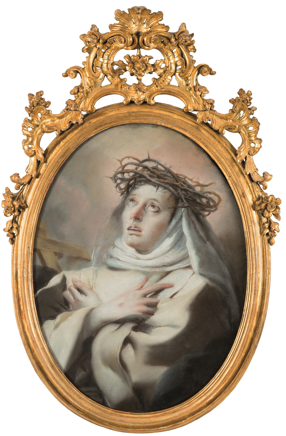 Raro il ricorso di Giambattista e Giandomenico all’uso del pastello, questa tecnica fu piuttosto utilizzata da Lorenzo Tiepolo, in particolare durante il suo soggiorno spagnolo (1762 – 1776). Proprio a Lorenzo fu attribuito questo struggente ritratto della Santa in estasi nella vendita Christie’s di Londra del luglio 2008.