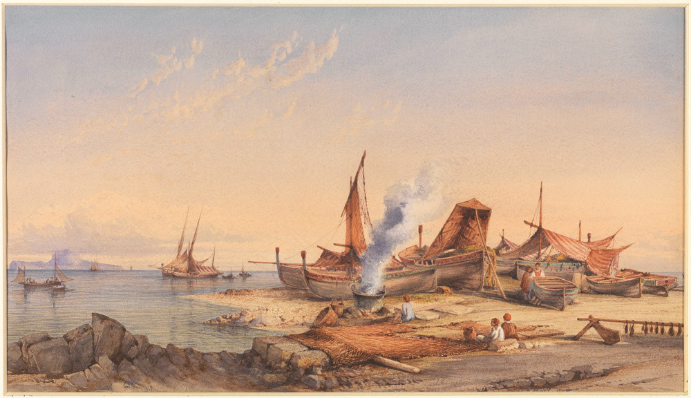 Carelli, Gabriele (Napoli 1820 – Londra 1900) BARCHE IN SECCA SU UNA...
