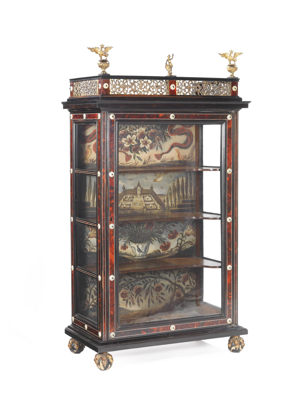 impiallicciato in tartaruga con applicazioni in avorio e profili in legno ebanizzato, parte superiore sormontata da cornice traforata in bronzo profilata in ebano e tartaruga sulla quale poggiano figura stante e aquile su vasi, interno dipinto a motivi floreali, volatili e scena di giardino all’italiana, base modanata su piedi in foggia di artiglio che ghermisce una sfera, cm 133x74x39