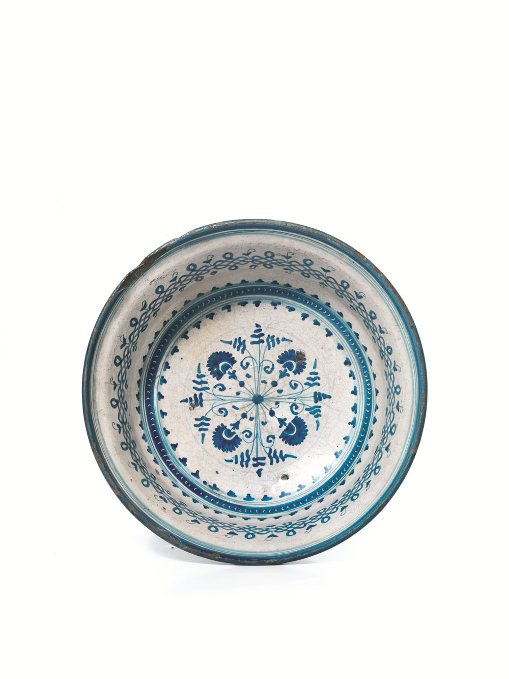 in maiolica dipinta in monocromia blu, con decorazione a “nodo orientale”, caratteristica questa della produzione delle botteghe di Montelupo in una fase che parte agli inizi del XVI secolo e si diffonde nella metà del secolo, in una struttura sempre più fitta e complessa: tale decoro è prevalentemente impiegato su forme aperte. Nella nostra coppa il nodo segue il bordo esterno della fruttiera, mentre il calice esterno e il fondo interno sono impreziositi da un motivo più articolato “alla porcellana”, caratterizzato dal tipico elemento floreale stilizzato; alt. cm 18,5, diam. cm 27,7, diam. piede cm 13,7