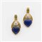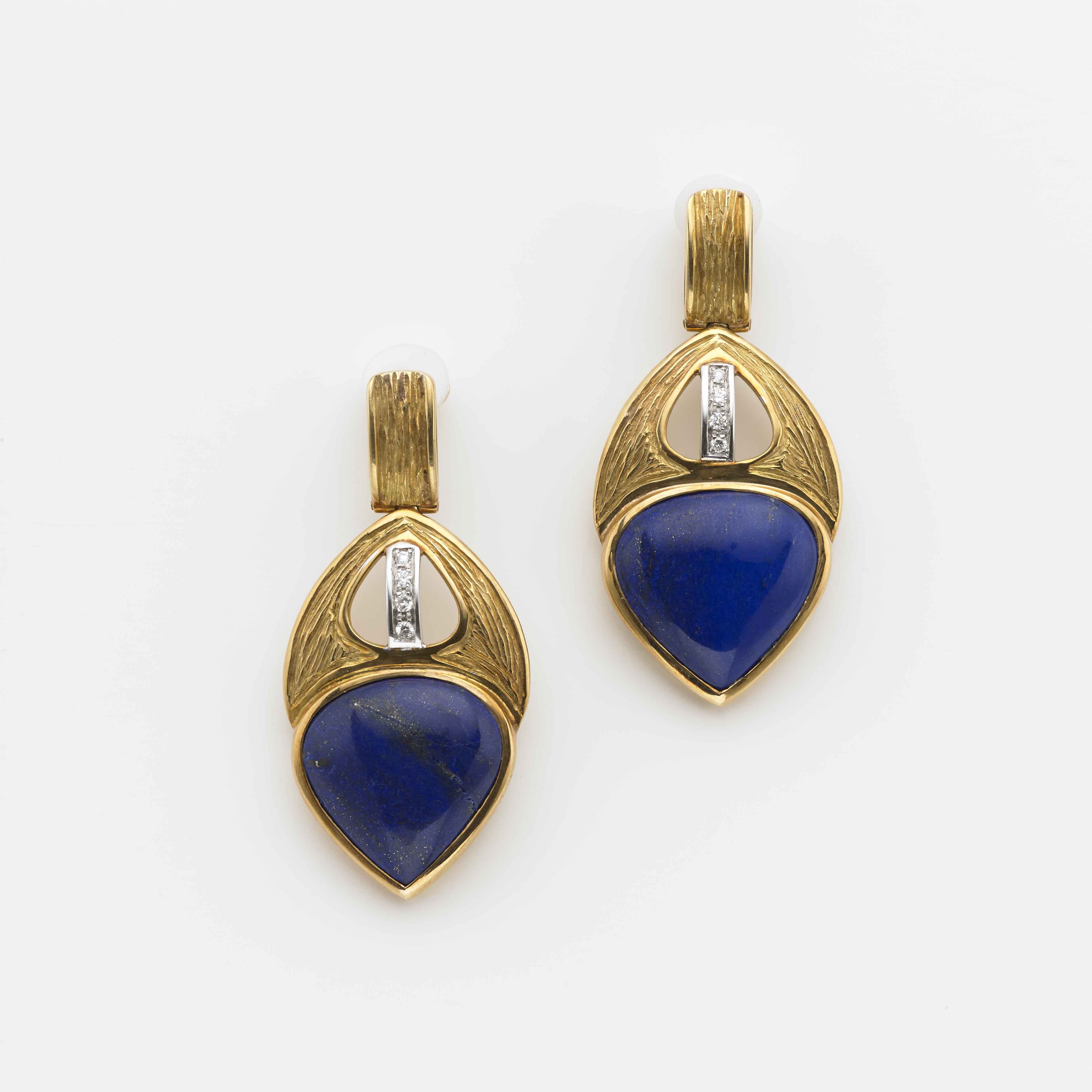 Orecchini pendenti perno e clips in oro giallo e bianco con lavorazione lucida e graffiata, diamanti rotondi taglio a brillante e due gocce di lapislazzuli, g.27,40 Lapislazuli and diamond gold ear-pendants