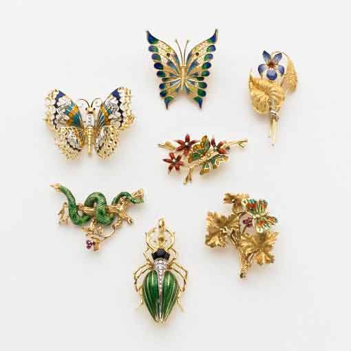 Lotto composto da sette spille flora e fauna in oro giallo, bianco e rosso con smalti guillochè cattedrali, rubini e diamanti g.82,10 Lot comprising seven yellow, white, and red gold brooches with guilloché enamels, rubies, and diamonds