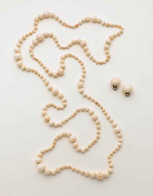 Demi-parure tutta in corallo bianco appena variegato rosa: collana lungh. 145cm circa con 15 scalature susseguenti da 4/5 a 10/13mm., orecchini a bottone 16mm. circa con clips in oro bianco, complessivi di g 122,60 White coral with rose shades and gold demi-parure comprising: a necklace and earstuds