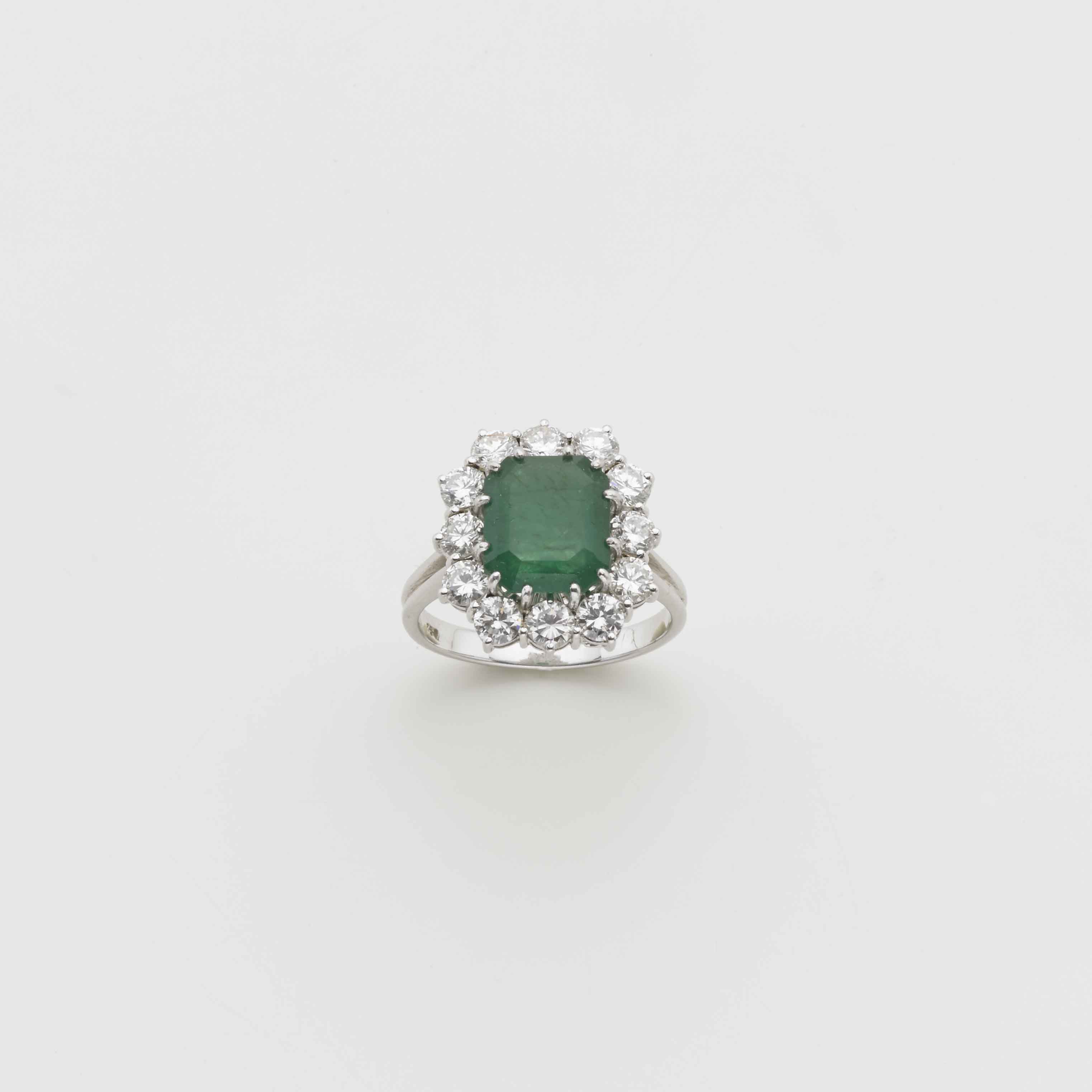 Anello in oro bianco con al centro uno smeraldo ottagonale di ct. 2,50 circa e contornato da diamanti rotondi taglio brillante, misura 13/53 g. 5,20 White gold ring with central octagonal emerald and surrounding diamonds