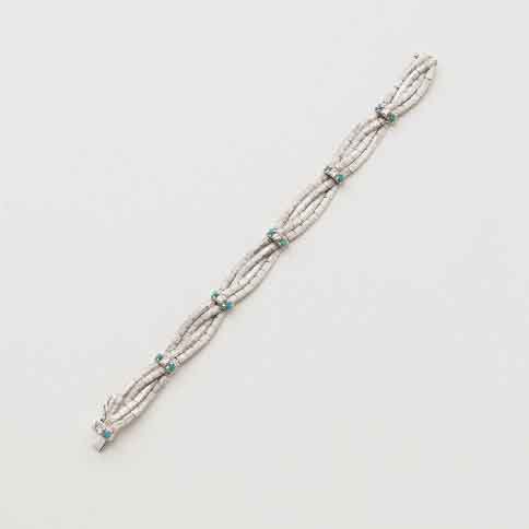 Bracciale in oro bianco lucido e satinato con diamanti rotondi taglio a brillante e piccoli turchesi rotondi taglio cabochon, lungh. cm 19, g.30,60 Polished and satin-finish white gold bracelet with diamonds and turquoises