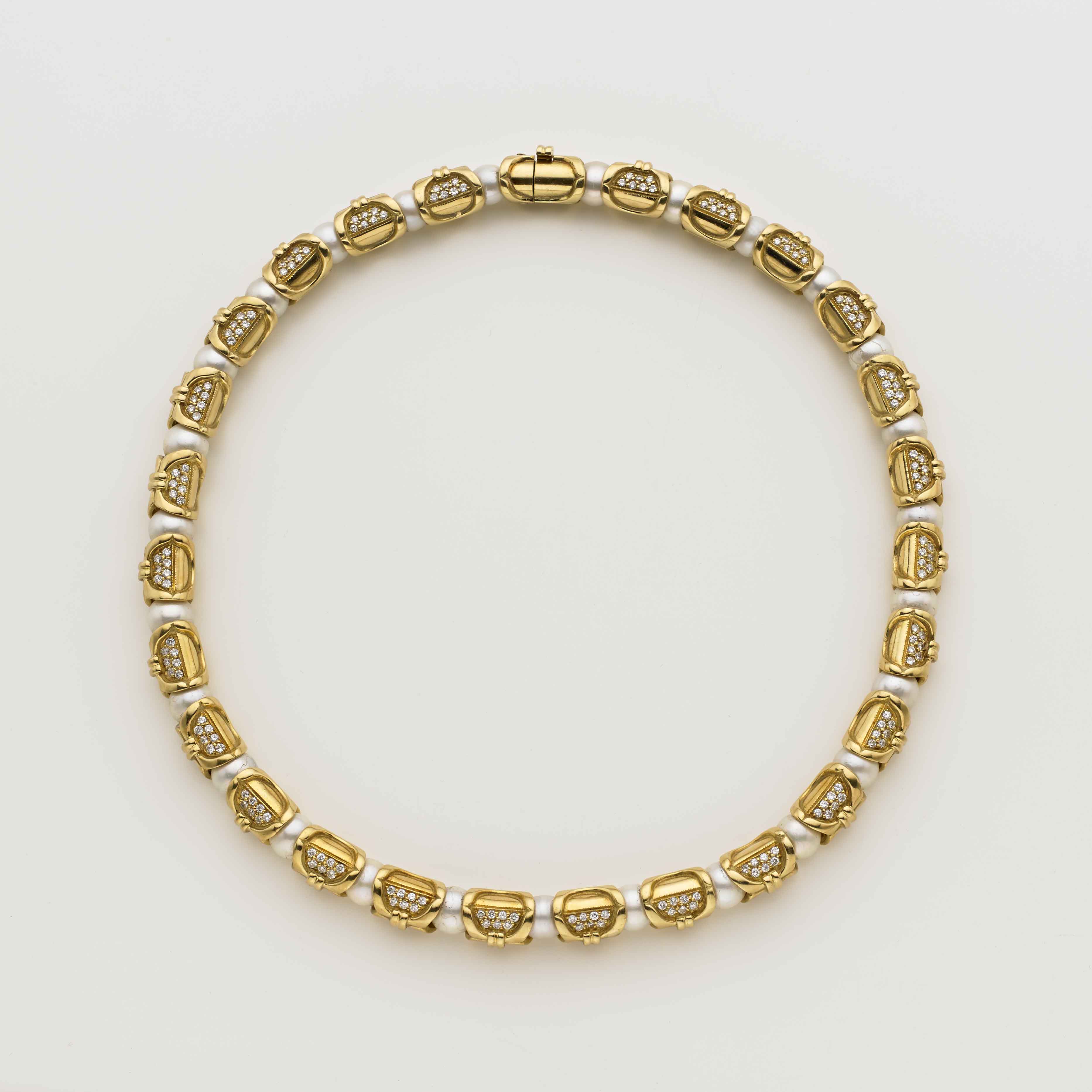 Collier in oro giallo con perle coltivate bianche intercalate da distanziatori in oro giallo con diamanti rotondi taglio a brillante complessivi g. 192,20 Gold necklace with white cultured pearls and gold spacers with diamonds