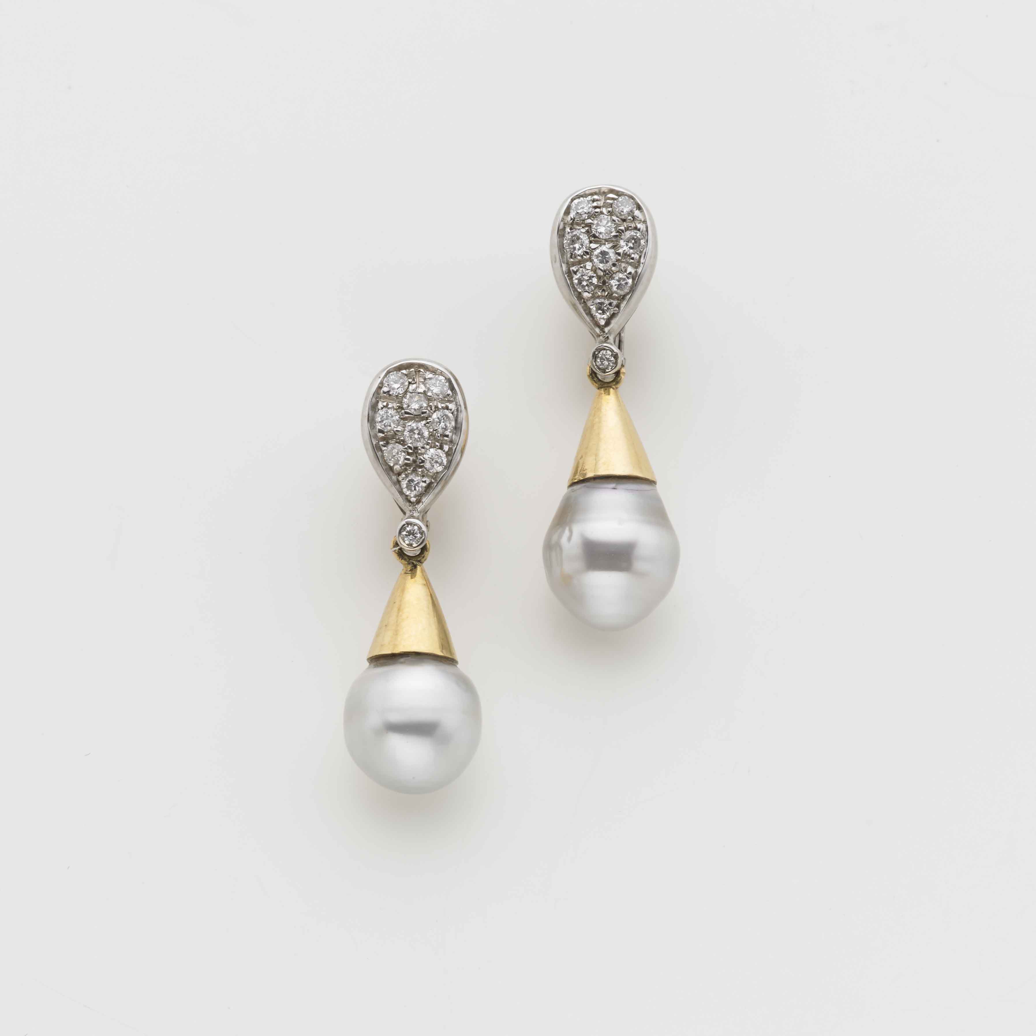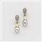 Orecchini pendenti in oro bianco e giallo con pavè a lobo di diamanti rotondi taglio a brillante a terminare i pendenti due perle bianche coltivate con sfumatura grigia g. 9,30 White and yellow gold drop earrings with diamond pavé and two cultured pearls