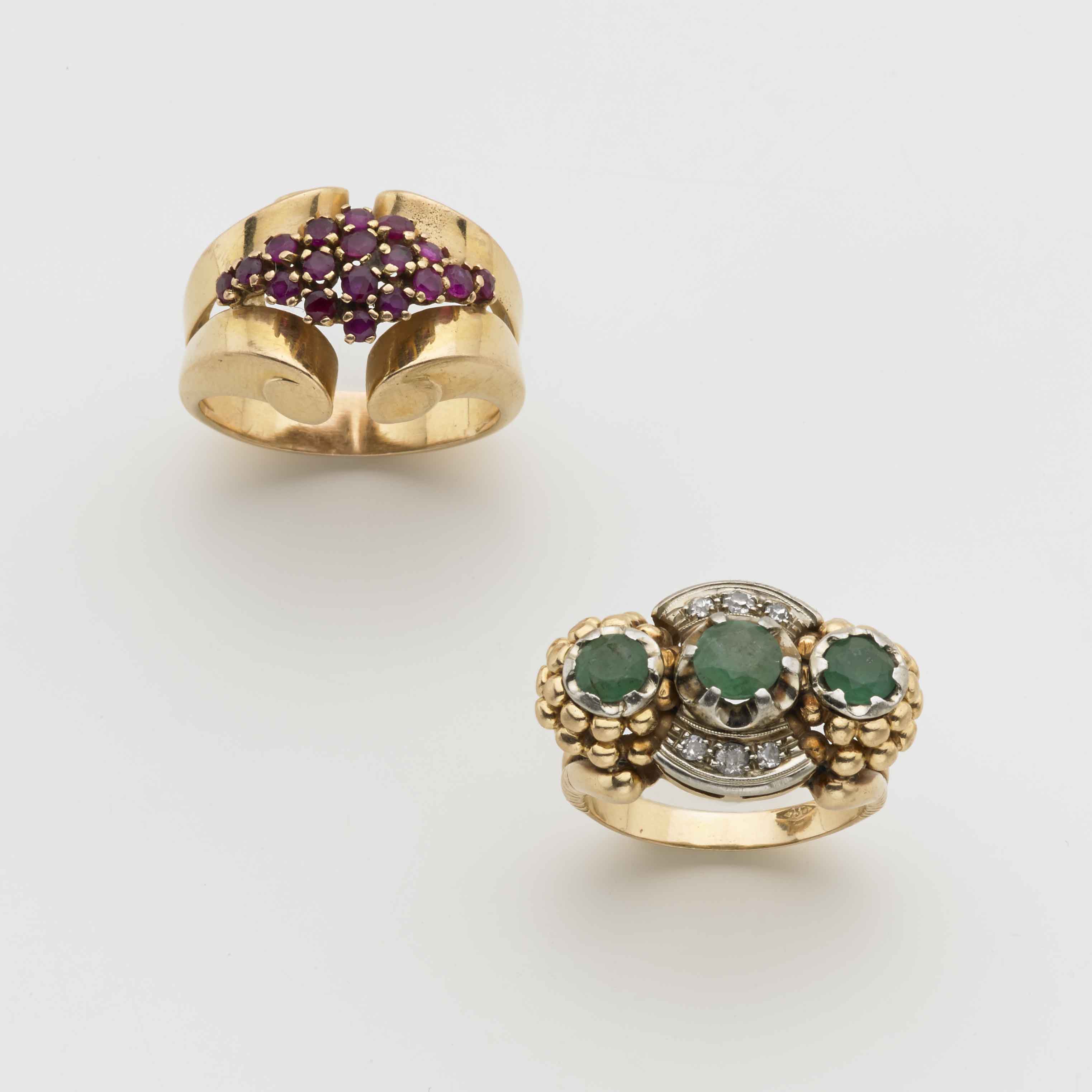 Lotto 59 | Lotto composto da due anelli, uno in oro giallo e bianco con tre smeraldi...