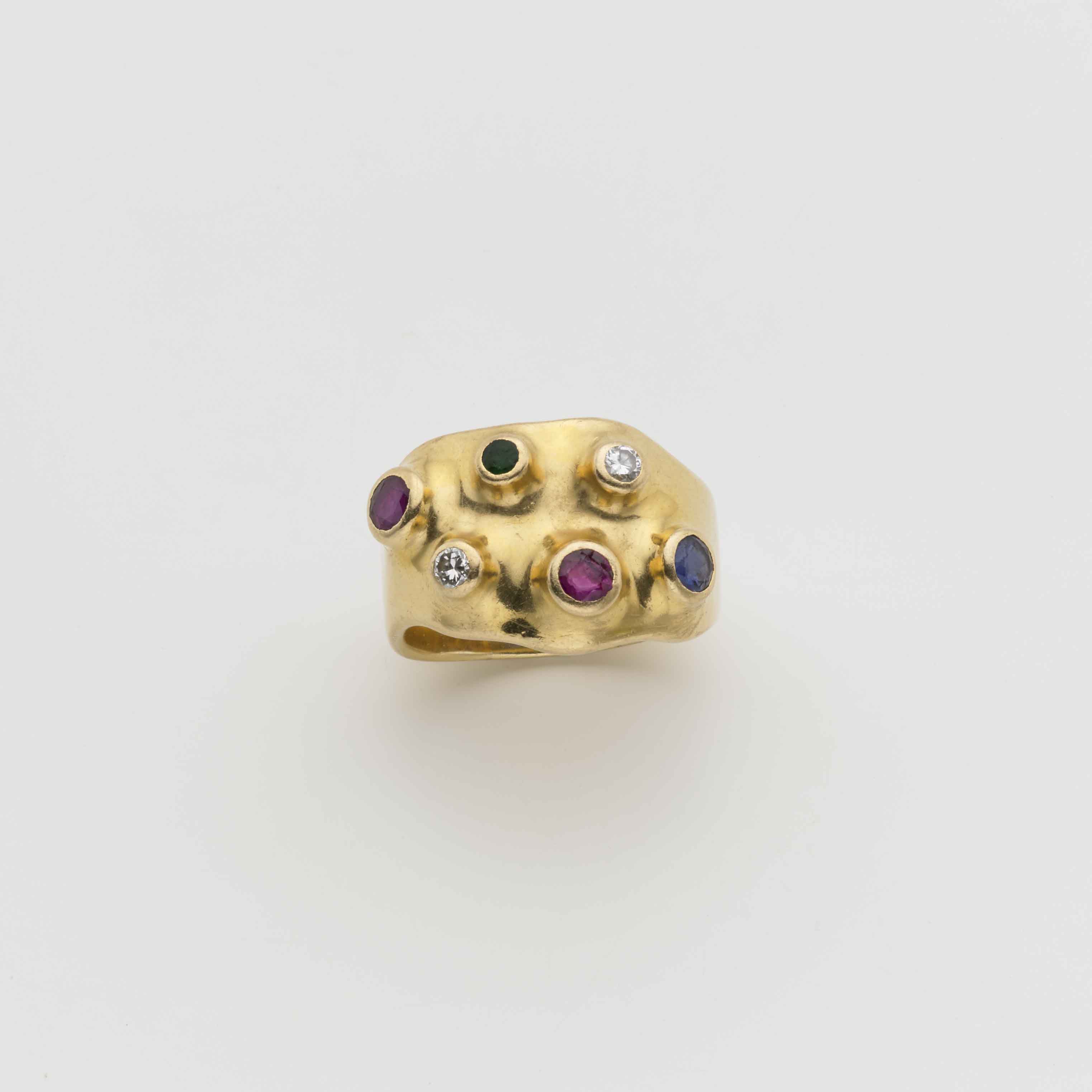 Anello in oro giallo con diamanti, rubini, zaffiro e smeraldo, g. 14,70,...