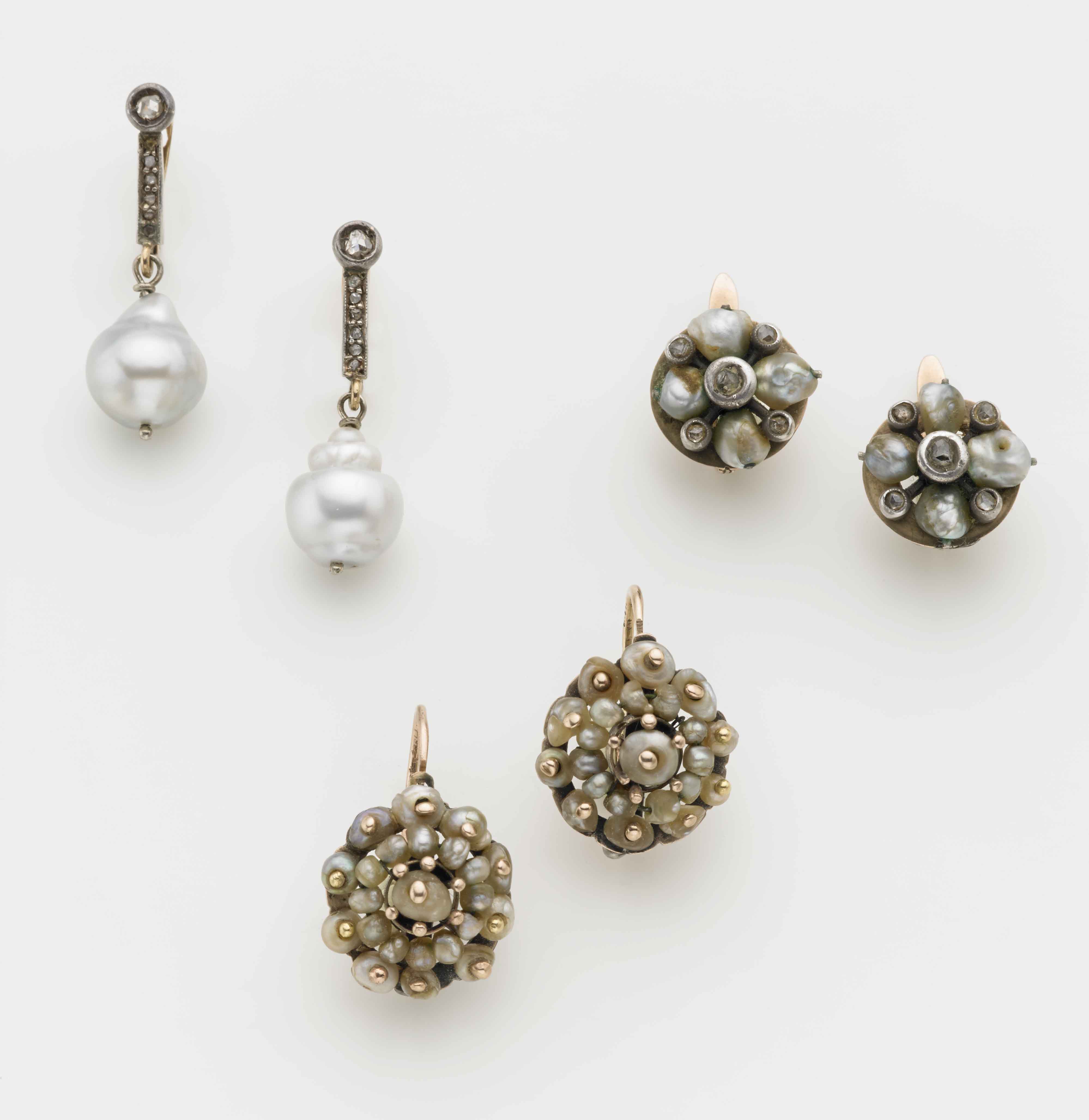 Lotto composto da tre paia di orecchini in oro rosso, argento, perle e diamanti, g. complessivi 18,80 Lot comprising three pairs of red gold and silver earrings with pearls and diamonds