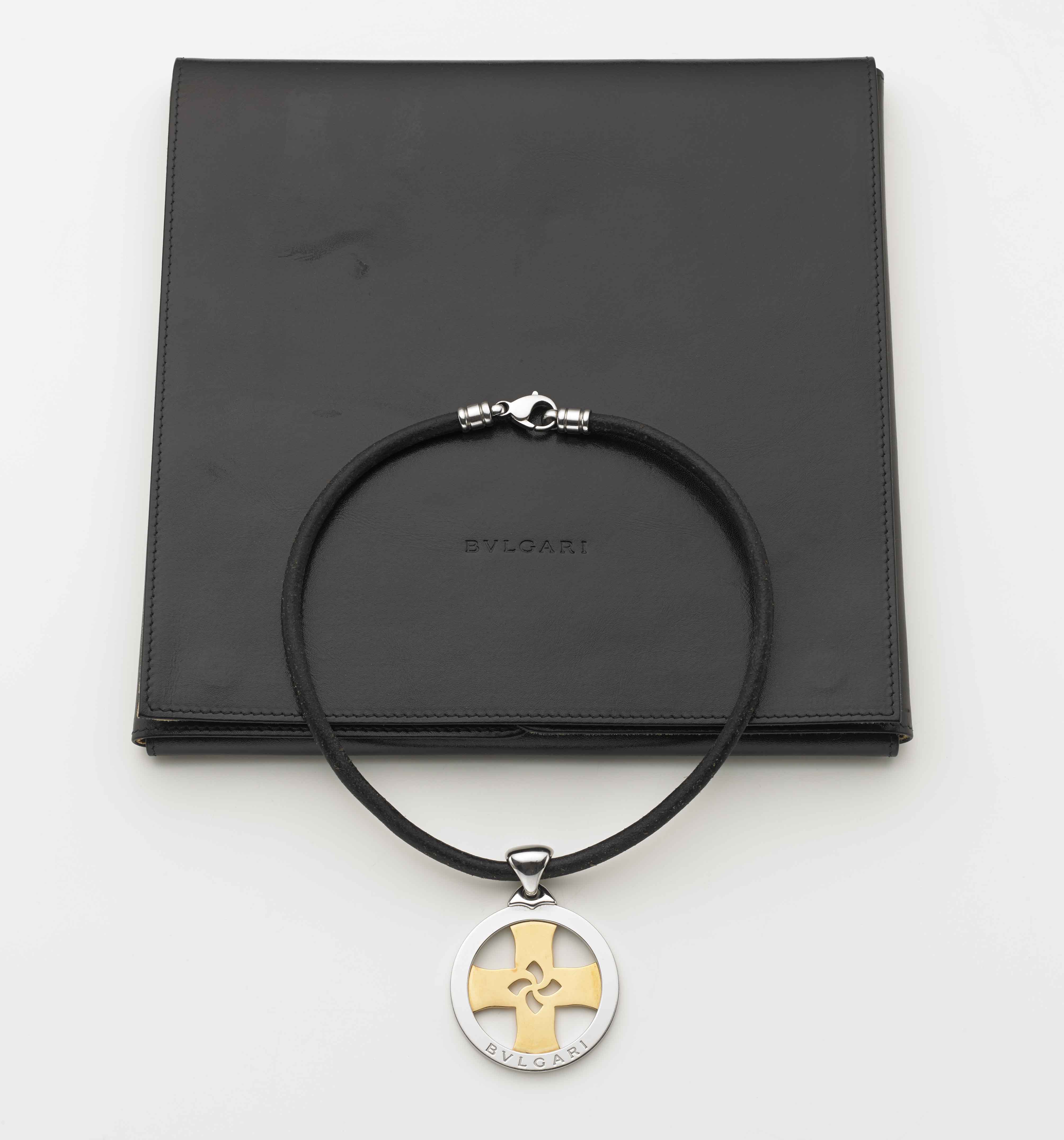 BULGARI Collier in acciaio e oro giallo con laccio in pelle, g. 36,50, astuccio e scatola originale BULGARI Steel and gold necklace with leather string, with original case and box