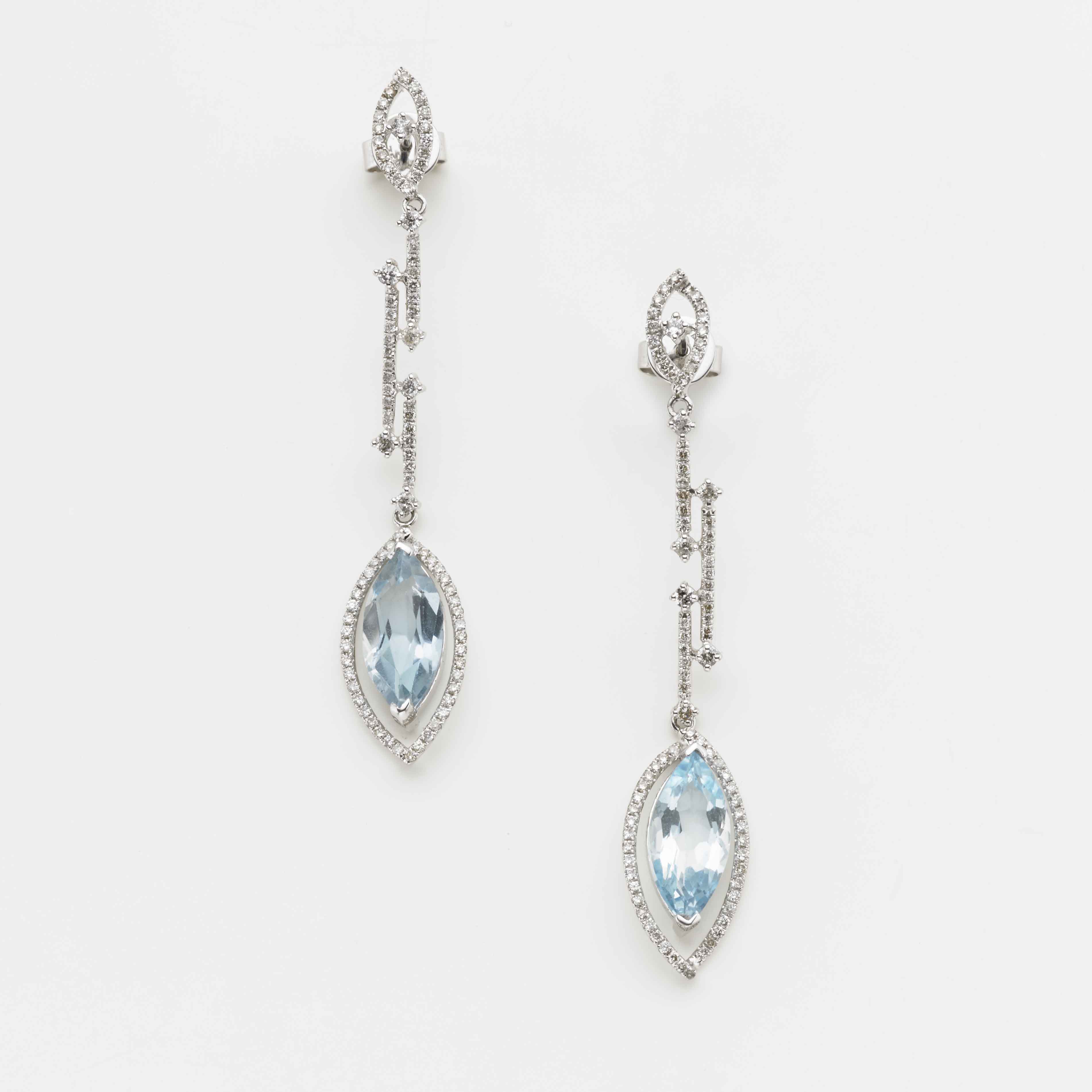 Orecchini pendenti in oro bianco con diamanti rotondi taglio a brillante per ct 1,10 circa e due acquamarine a navette per ct 7,30 circa g. 7,60 White gold drop earrings with diamonds and aquamarines
