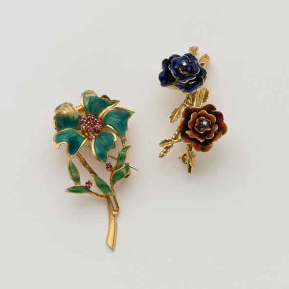 Due spille in oro giallo e smalti, in una piccoli rubini rossi, l'altra due piccoli diamanti sui fiori girevoli, complessivi g.21,30 Two gold enamelled brooches, one with small rubies, the other with small diamonds