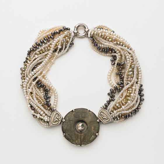 Collana girocollo a diciotto fili di perle ed elemento centrale in metallo e argento dorato, giada, perla e smeraldo, lungh. cm 43.5, g.263,20 Multi-strand pearl necklace with central gilt-metal, silver, jade, pearl and emerald element, lenght cm 43.5