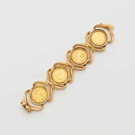 Bracciale in oro giallo come le quattro sterline vecchio conio, lungh. cm 16,50, g. 81,90 Gold bracelet and four old gold sovereigns