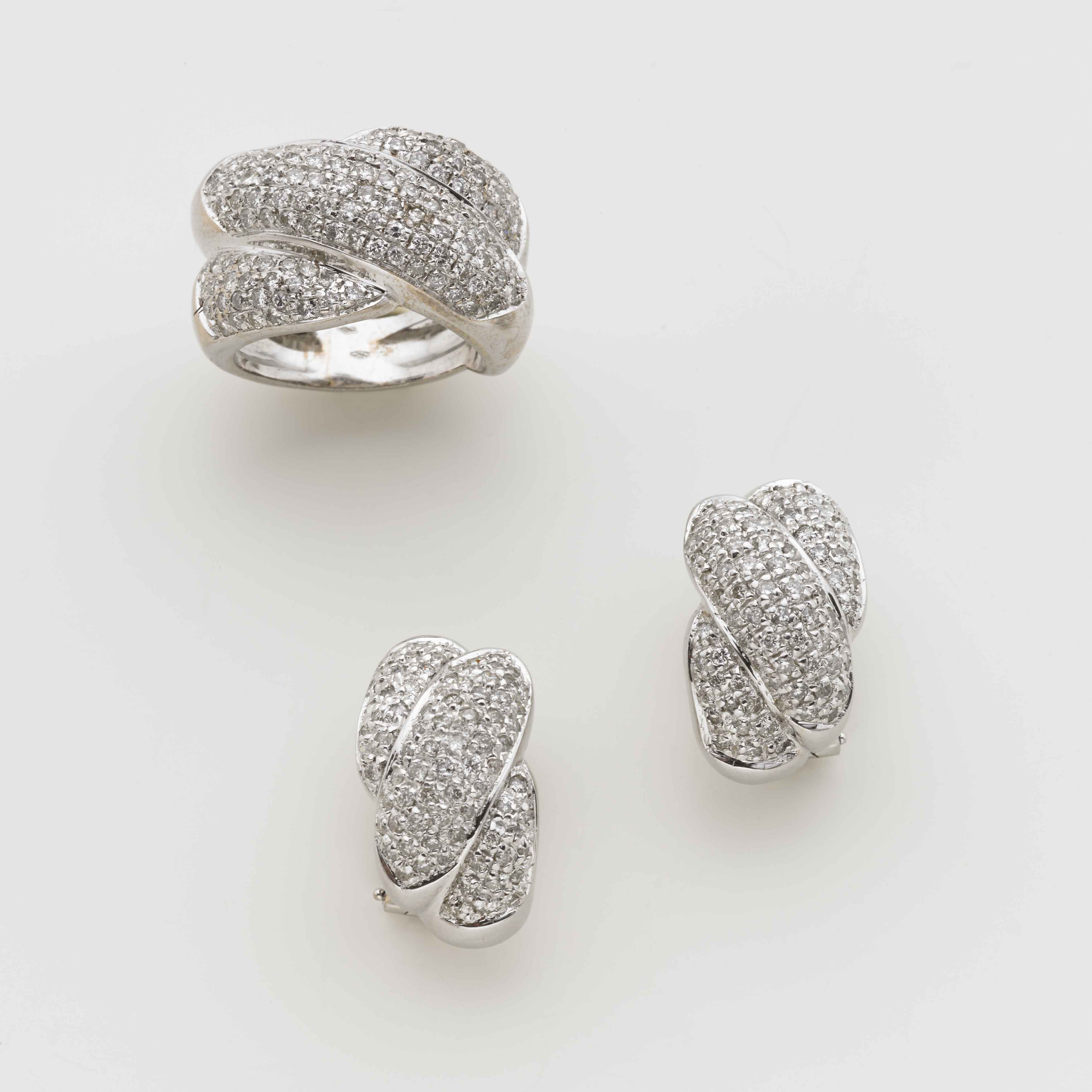 Demi-parure in oro bianco e diamanti formata da anello ed orecchini a ricordare nodi intrecciati complessivi g. 34, misura anello 17/57 White gold demi-parure comprising a ring and earrings