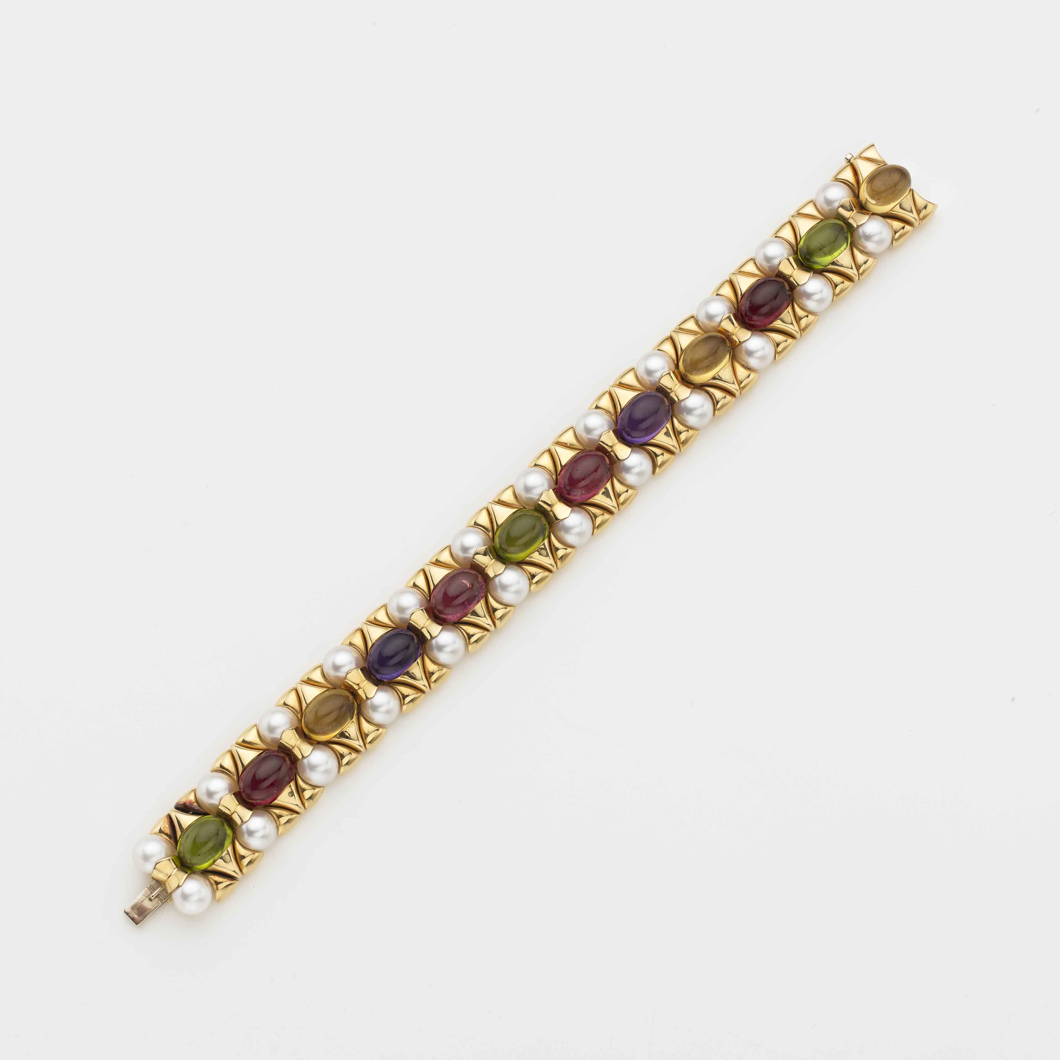 BULGARI Bracciale in oro giallo perle coltivate bianche e gemme ovali cabochon di vari colori tra le quali quarzi, tormaline e granati g. 115, lungh. cm 19,50, alt. cm 2. Astuccio originale BULGARI Gold bracelet with white cultured pearls and oval coloured gemstones including quartzes, tourmalines, and garnets. Original case