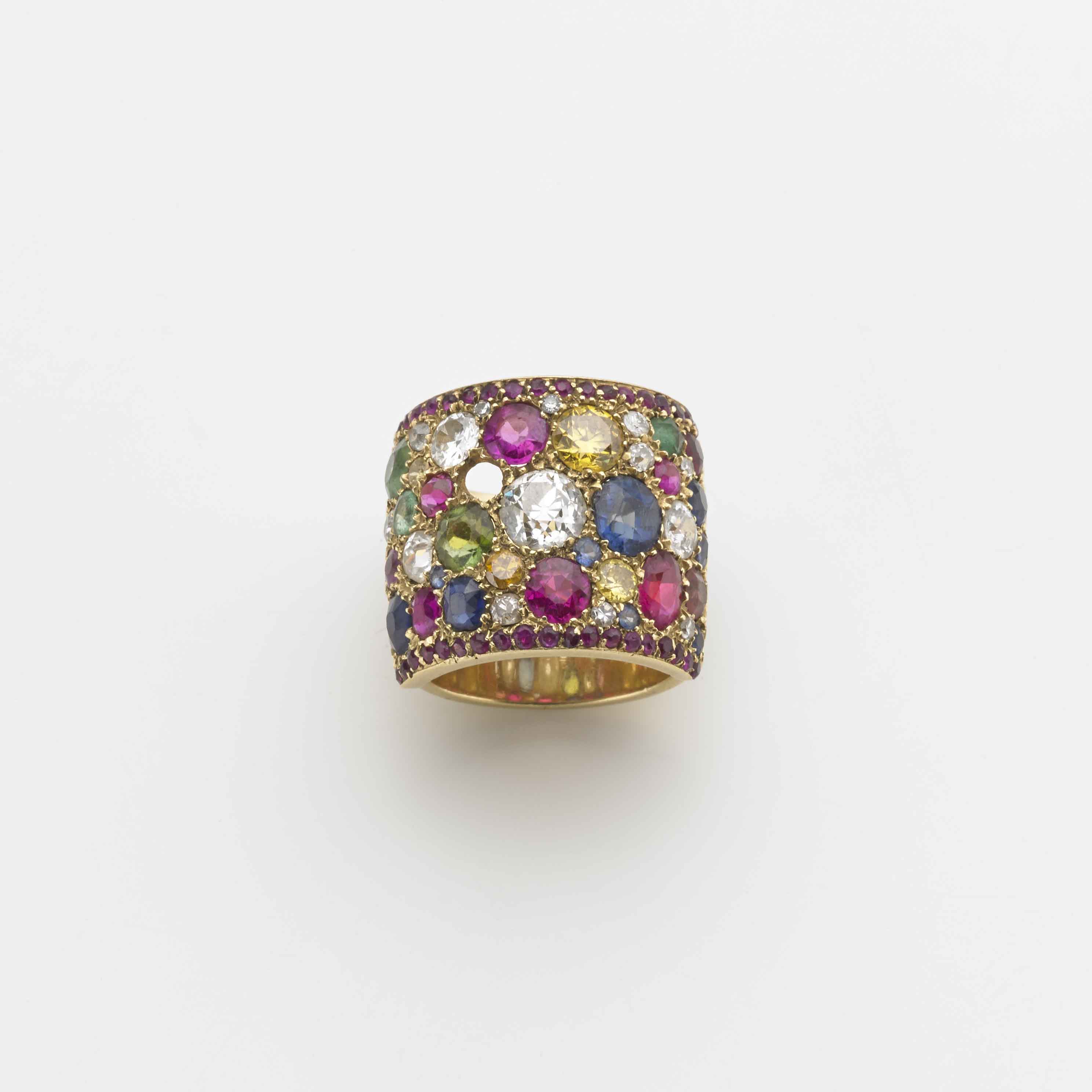 Anello a fascia in oro giallo con pavé di varie gemme tra cui diamanti,...