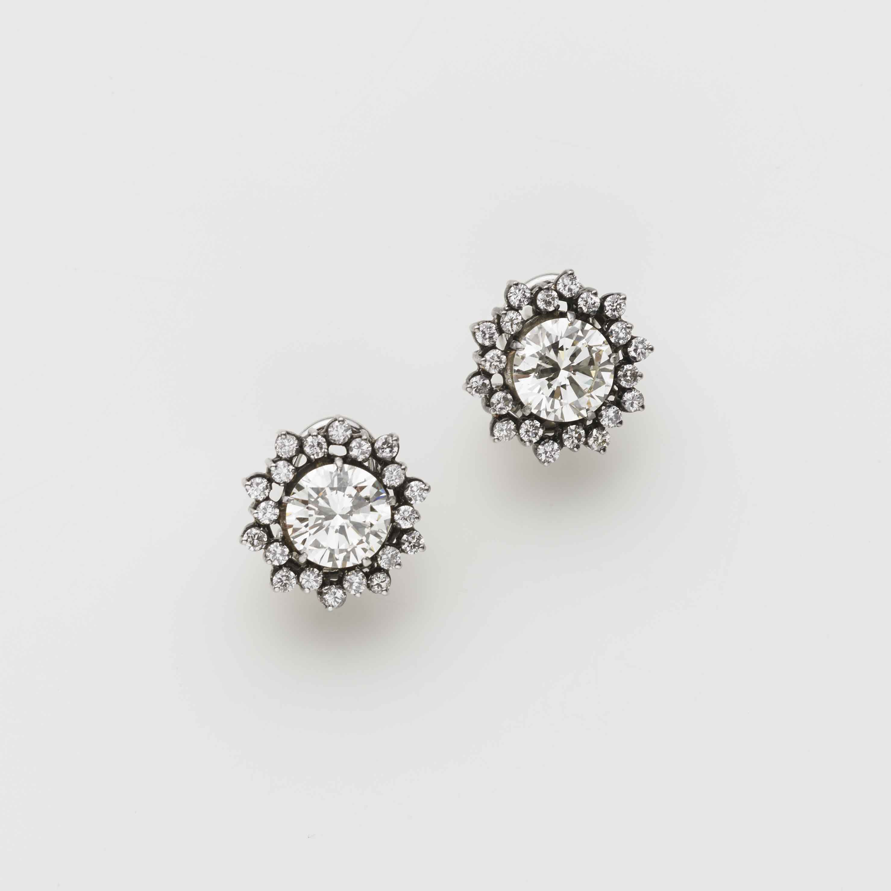 Orecchini a lobo perno e clips in oro bianco con due diamanti centrali rotondi taglio a brillante di ct 2,53 e 2,47 entrambi contornati da venti piccoli diamanti g. 8 Accompagnati da analisi gemmologica CISGEM diamond report n. 1661IAAB e n. 1161IAAB del 22/09/2015 Milano White gold earrings with diamonds. Appended CISGEM diamond report